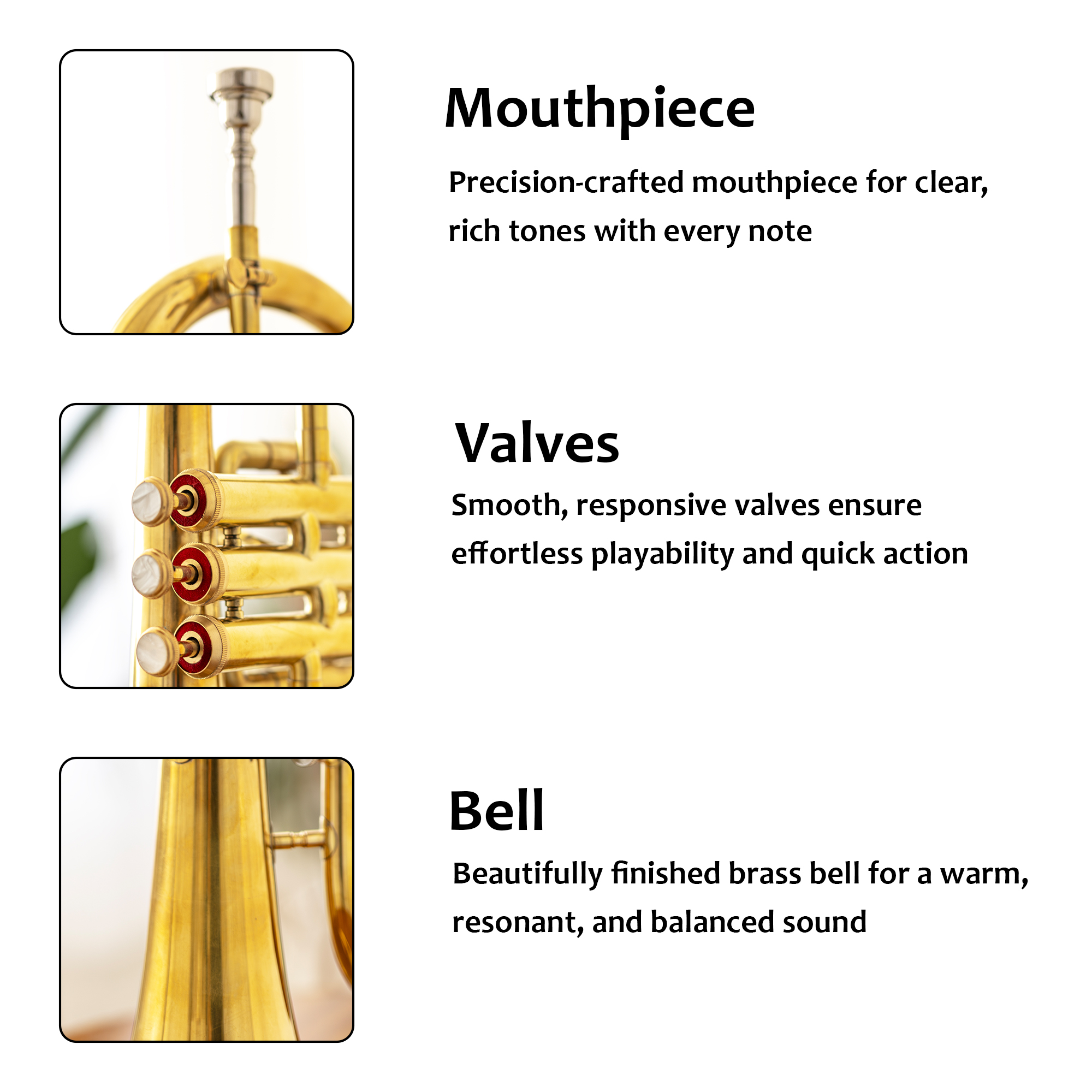 The easy-to-play 3-valve system ensures smooth fingering and accurate notes, making it ideal for learning, practice, and ensemble performance. This complete set includes a mouthpiece and padded carrying case, so you’re ready to play right away.
