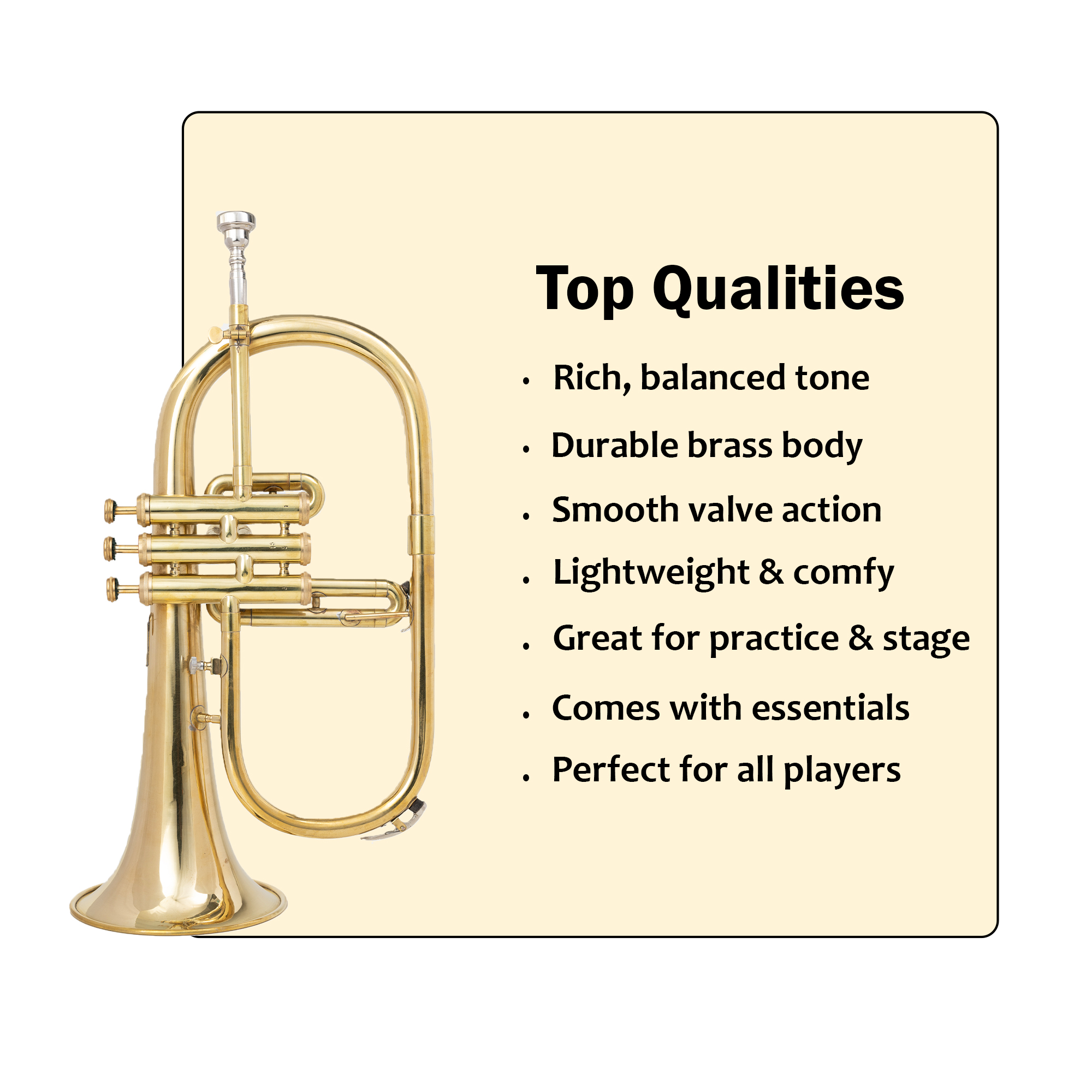 Bring your music to life with the QueenBrass Bb Flugelhorn—perfect for learning, performing, and enjoying rich brass tones anywhere.